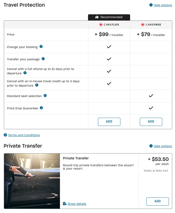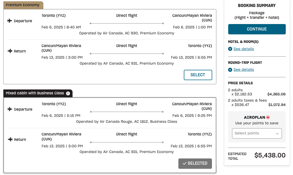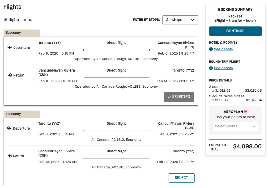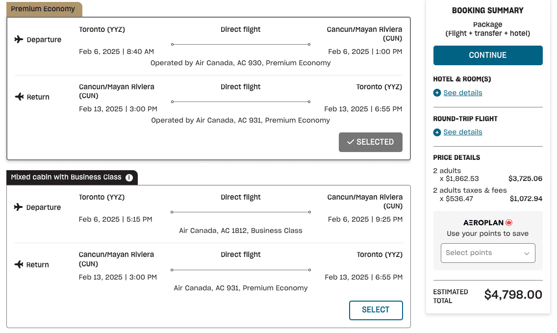One downside that we’ve noted here with Air Canada Vacations’ booking system is that the different flight prices aren’t displayed up front, so you’ll need to select each option individually to check pricing.