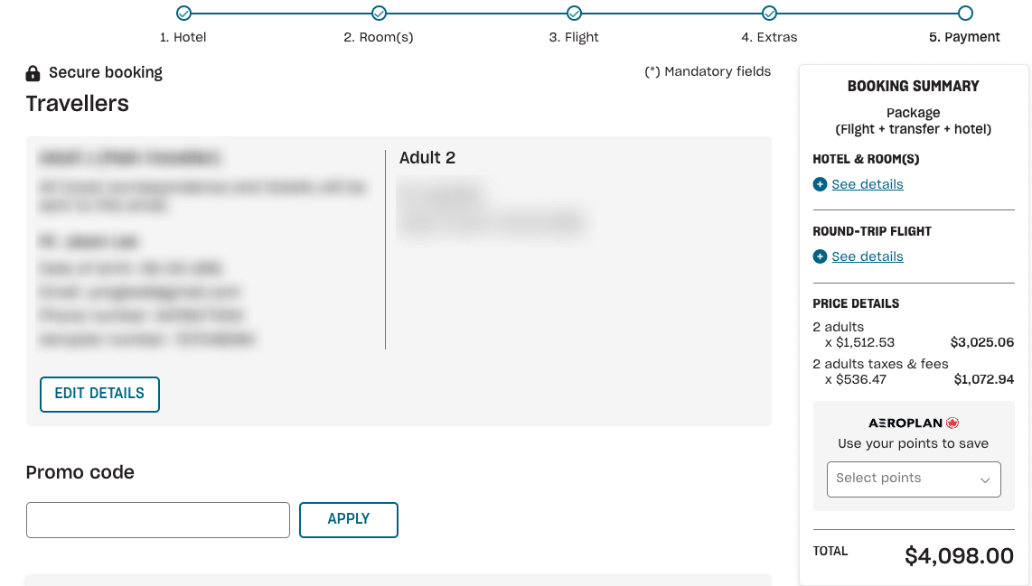 Make sure to also input your Aeroplan membership number (each traveller should enter their individual number) to earn Aeroplan points from the flight portion of your package and to get any bonus Aeroplan points that are offered as part of a deal.