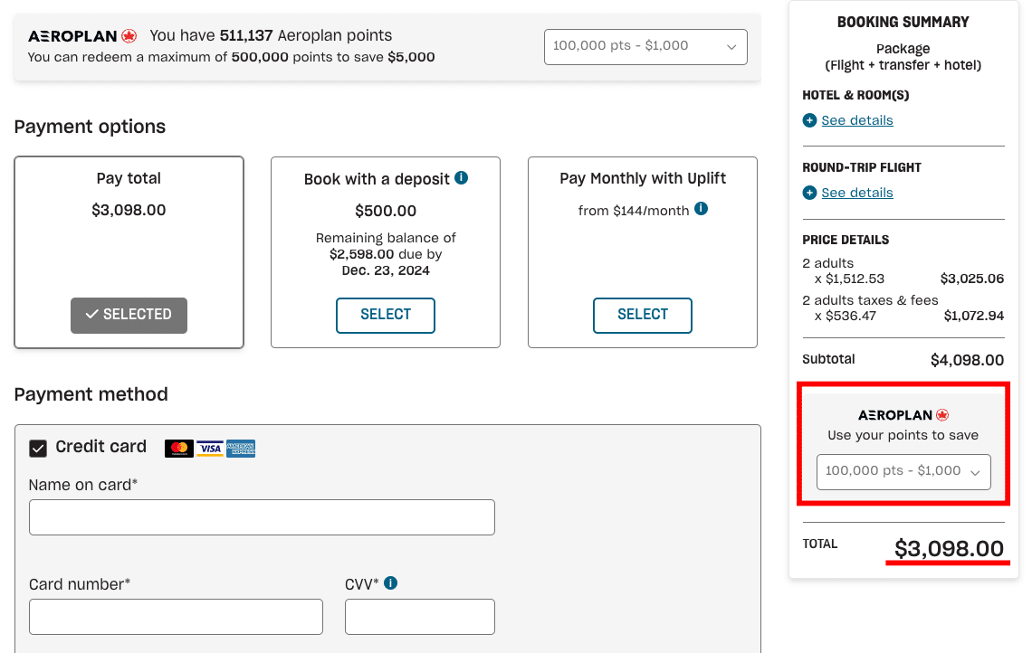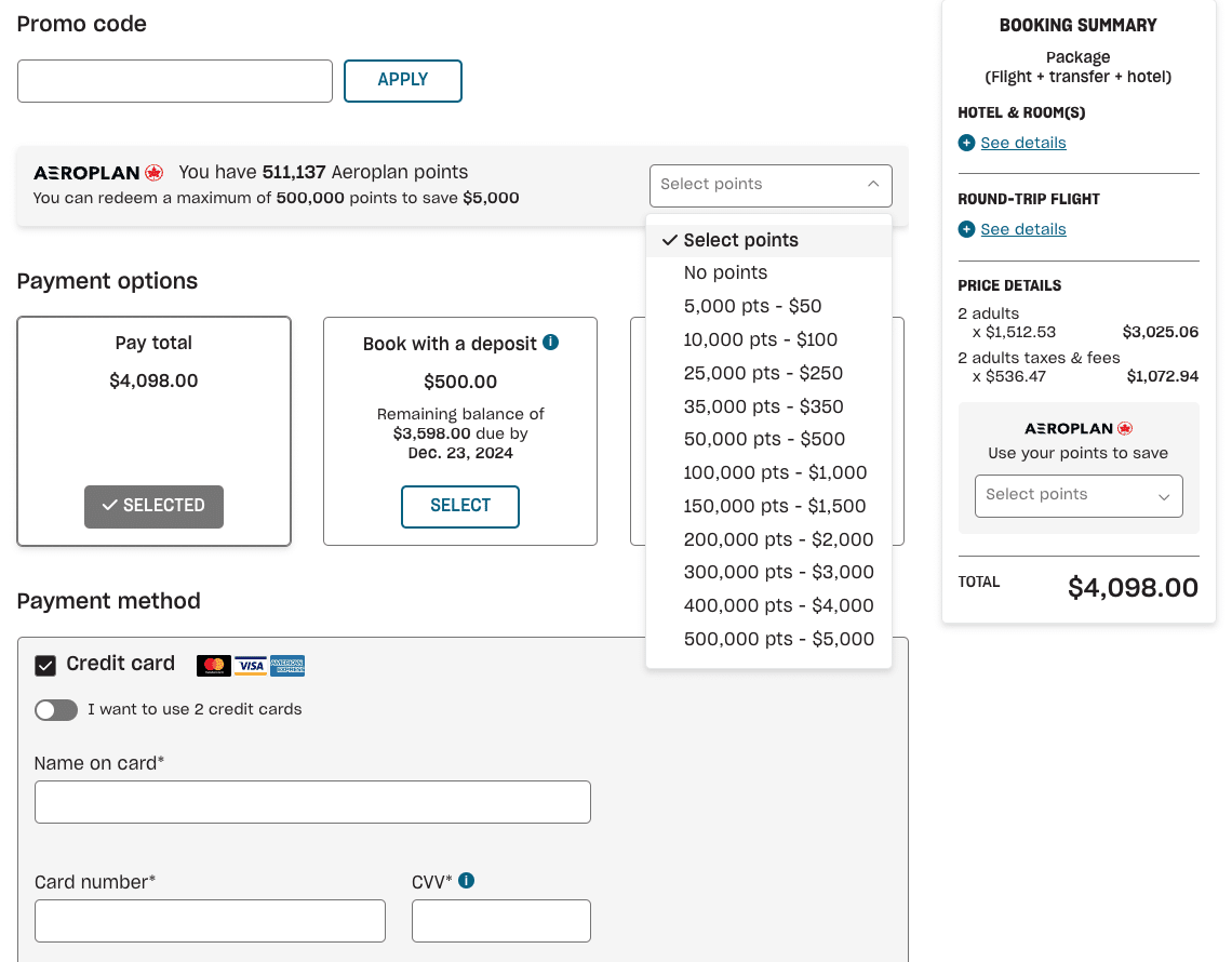 Here, you can choose to redeem for part or all of your vacation using Aeroplan points, with a maximum redemption cap of 500,000 Aeroplan points.