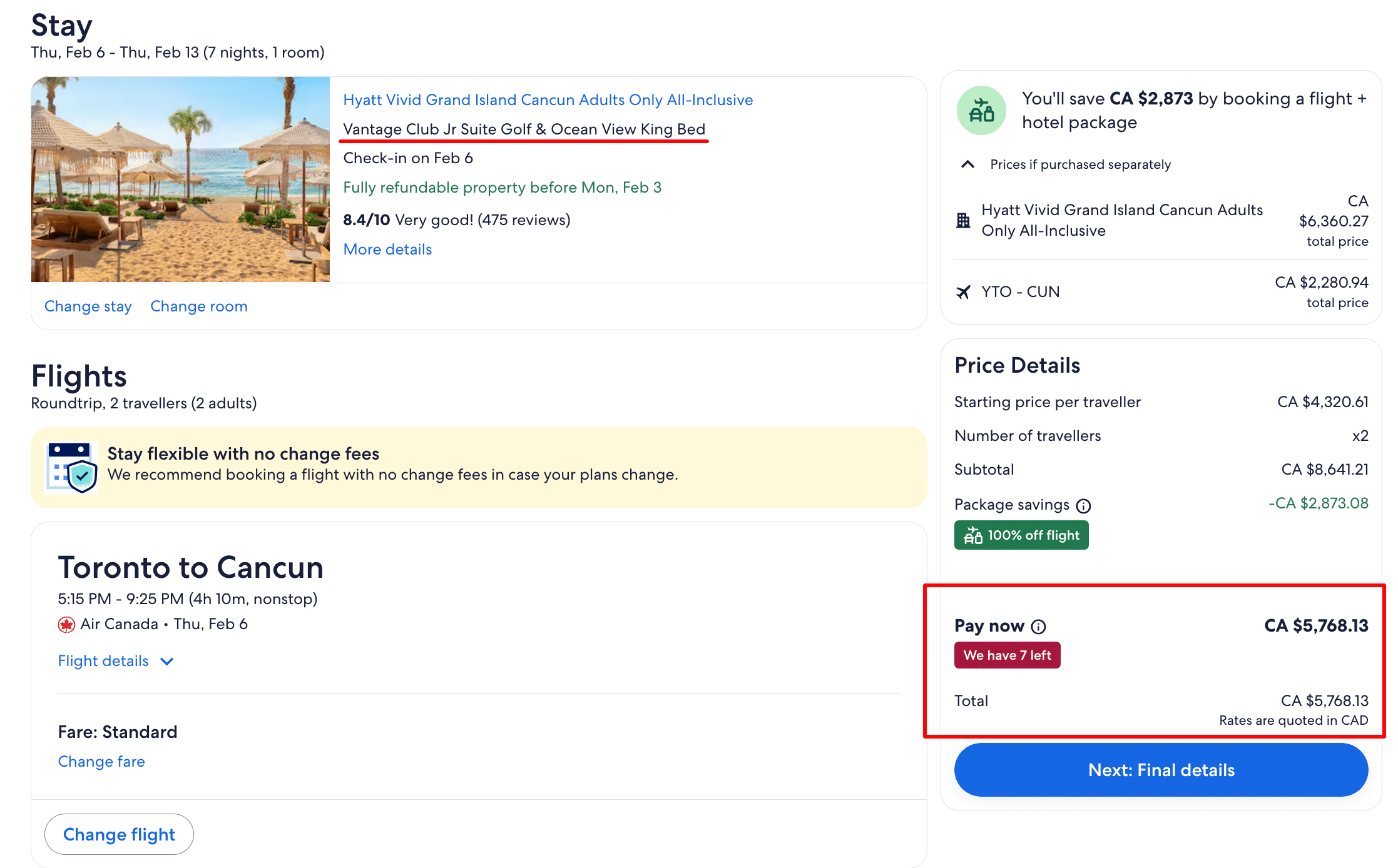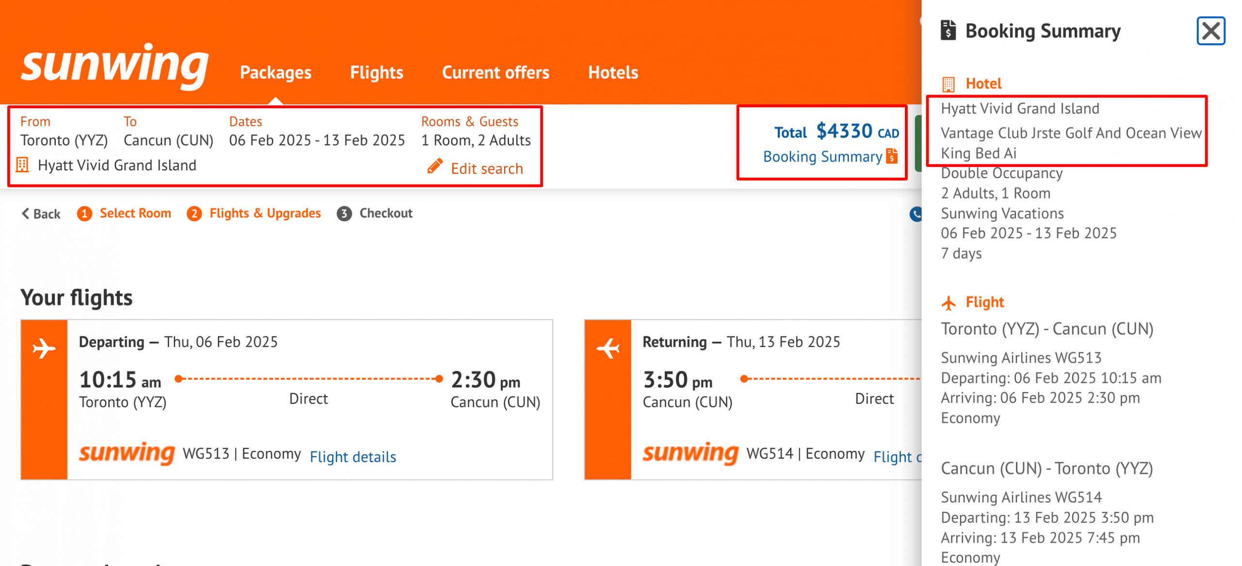 For this example, we’ll stick with our 7-night Cancun trip at Hyatt Vivid Grand Island for two people, same flight dates and same room type.