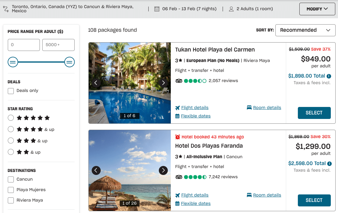 For this example, we’ll look for a seven-night-stay package in Cancun for two people.