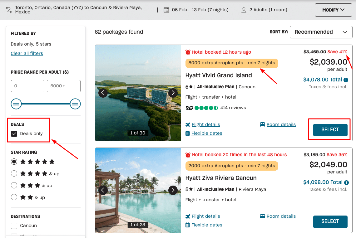 For our example booking, we’ve selected the “Deals only” option and chosen the Hyatt Vivid Grand Island for our seven-night vacation, which earns an extra 8,000 Aeroplan points.